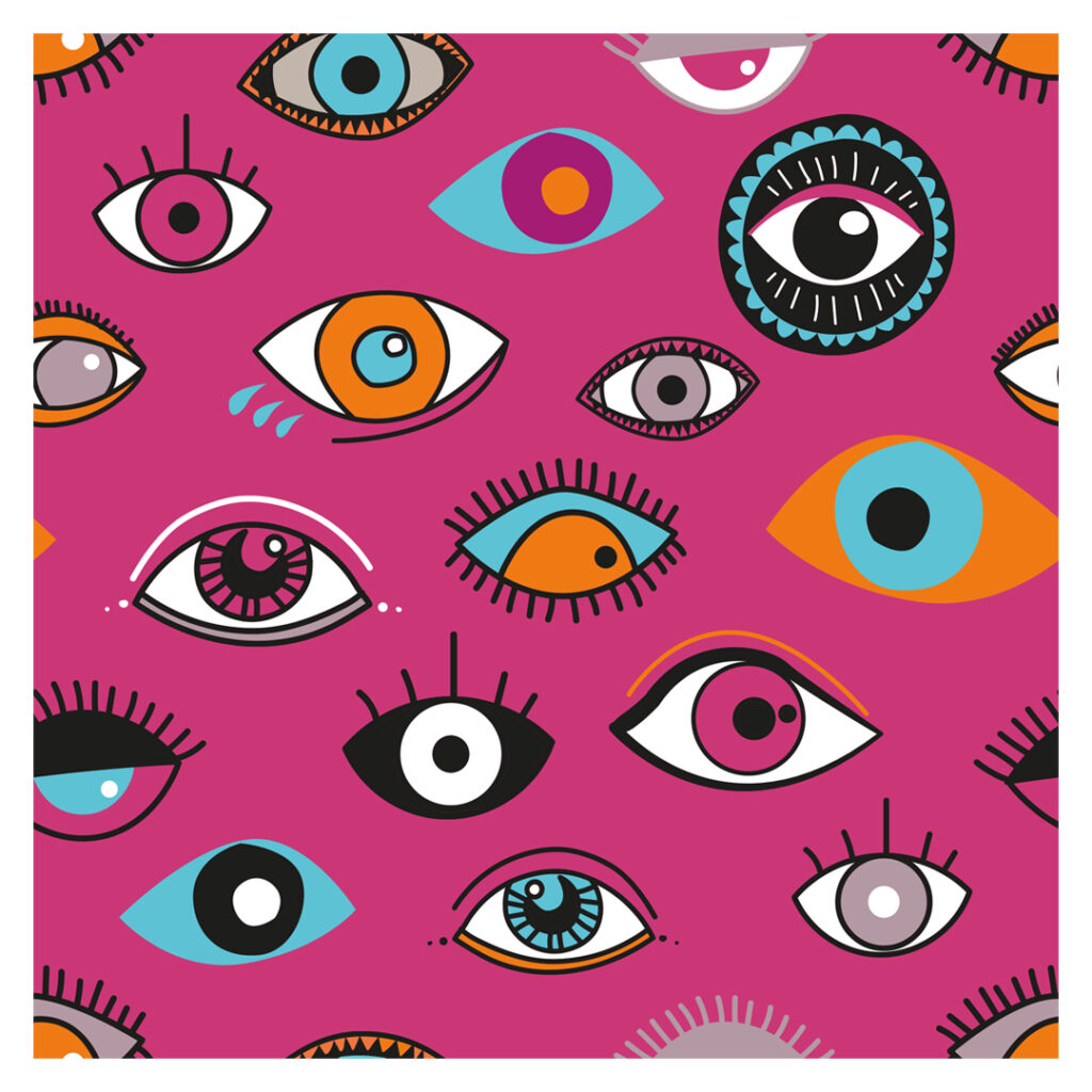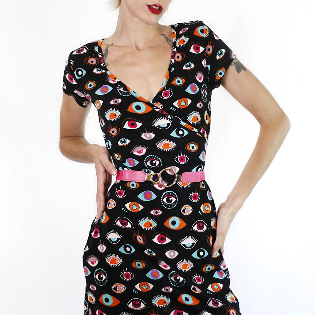 Two versions of this eye pattern. We play with pink and black. Different and strange eyes are watching us in this pattern. Color is the protagonist. Serendipity is the name of this collection for Spring-Summer'21. Minueto has different pieces with these patterns: dress, blouses, t-shirts...